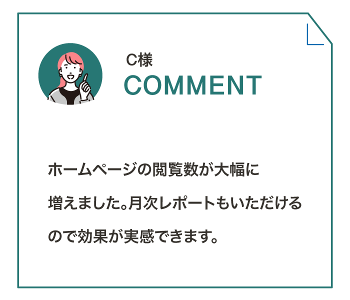 検索順位とパフォーマンスデータのレポートを毎月お送りいたします。対策の効果や今後の運用にお役立てください。